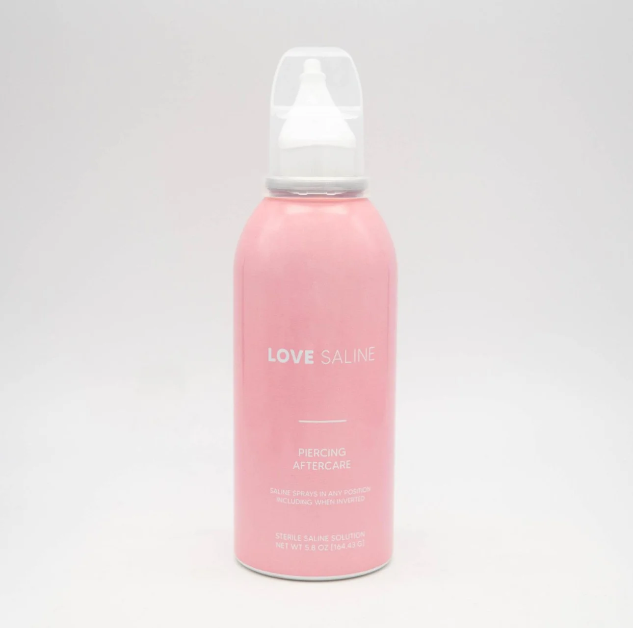The number one product we recommend when caring for your piercing is a sterile saline solution like Love Saline. Simply spray the saline onto the piercing (front and back or top) and let it sit for five minutes, then rinse thoroughly. Doing this before a shower is a great way to ensure it gets rinsed properly. It’s as easy as that!